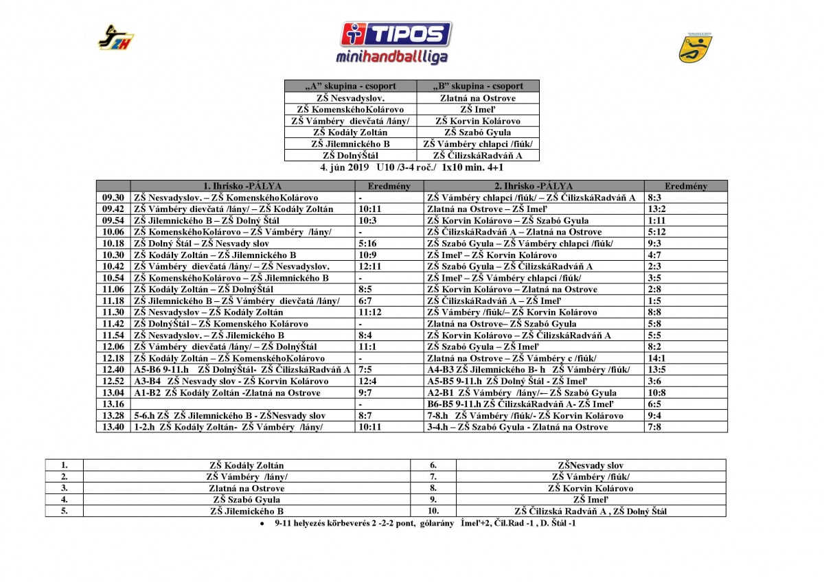 A felső házi döntőbe 12 csapat került, végül azonban 11 csapat jelent meg, és játszott nagyon izgalmas mérkőzéseket – tudhattuk meg Brunczvik Tünde utánpótlás koordinátortól. „Két csoportban versengtek a gyermekek, és már a csoportmérkőzések nagyon izgalmasak voltak de a keresztjátékok úgy szintén. A harmadik helyért tartó párbajban csak a rendes játékidő döntetlene után következő büntetők által tudtuk meg, hogy Csallóközaranyos csapata állhat fel a dobogó harmadik fokára. A döntőben két dunaszerdahelyi iskola mérkőzött meg, a Kodály Zoltán AIapiskola csapatától két góllal bizonyult jobbnak a Vámbéry Ármin AIapiskola lány alakulata. A játéknap végeztével az eredményhirdetésen az összes csapat érmet és oklevelet kapott, melyeket Kelecsényi Ernő a Szlovák Kézilabda Szövetség alelnöke és Horváth Zoltán klubelnök adott át.